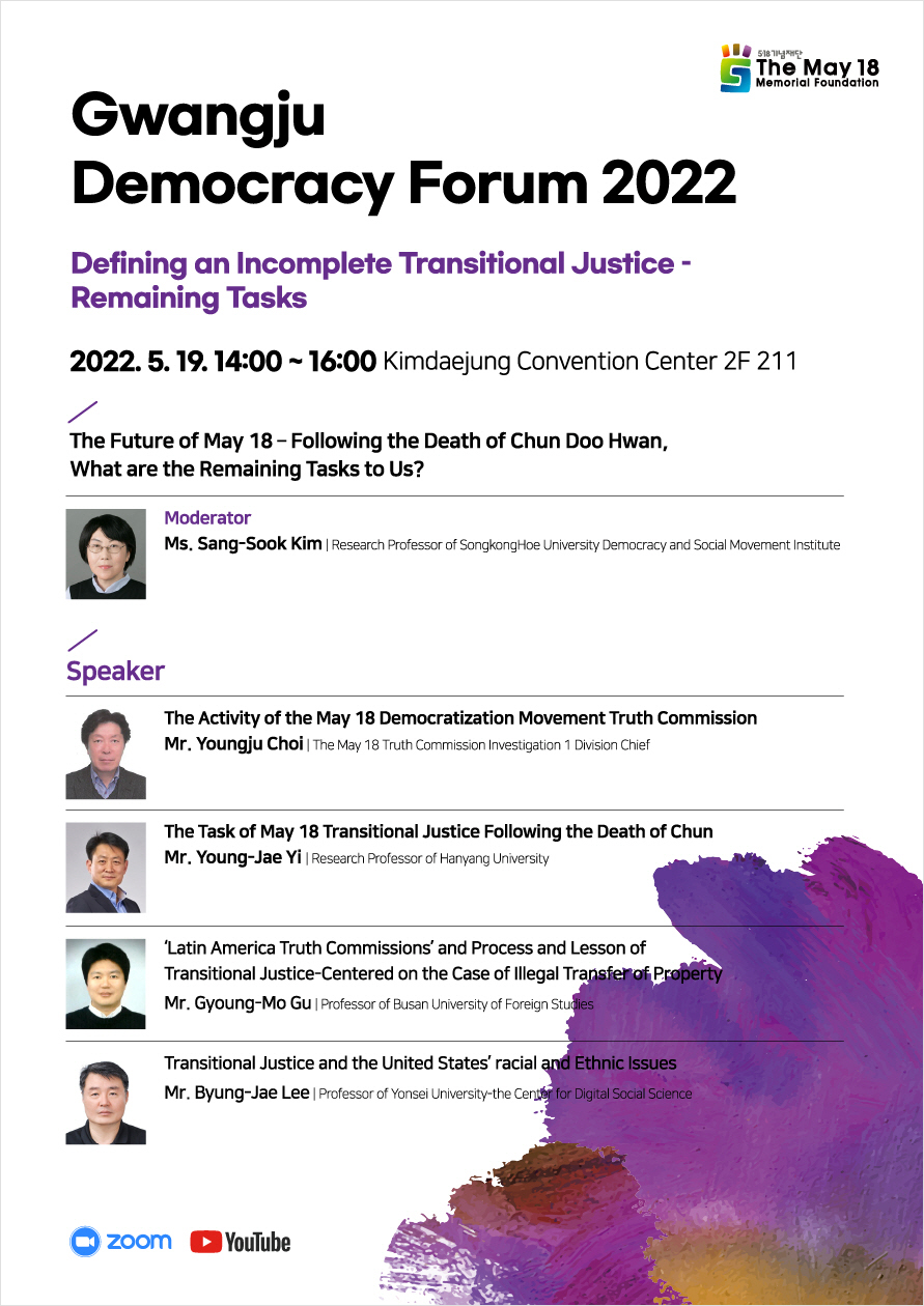 This session discusses the remaining tasks to us and future activities for transitional justice at this point in which the May 18 Democratization Movement Truth Commission is actively investigating the May 18 Democratic Uprising.