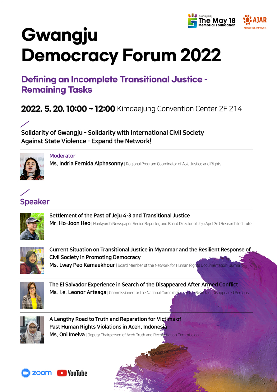 Through this session in Gwangju, South Korea, the May 18 Memorial Foundation provides a space for transnational solidarity against state violence, genocide, and enforced disappearance. Together with Asia Justice and Rights (AJAR), this session invites those who work in the sector of civil society in each country to talk about transitional justice and historical reckoning.