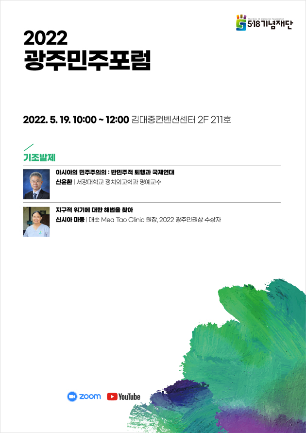 | 세션소개 | 본 세션은 2022 광주민주포럼의 주제인 “지구적 위기에 대한 해법을 찾아 - 일상과 공동체 회복을 위한 협력과 연대”를 여는 발제로서 코로나 팬데믹으로 촉발된 민주주의의 위기와 미얀마를 필두로 아시아 국가들에서 나타나는 민주주의의 역진과 우려에 대해 현황과 전망, 대안을 들어보는 시간을 갖는다. | |